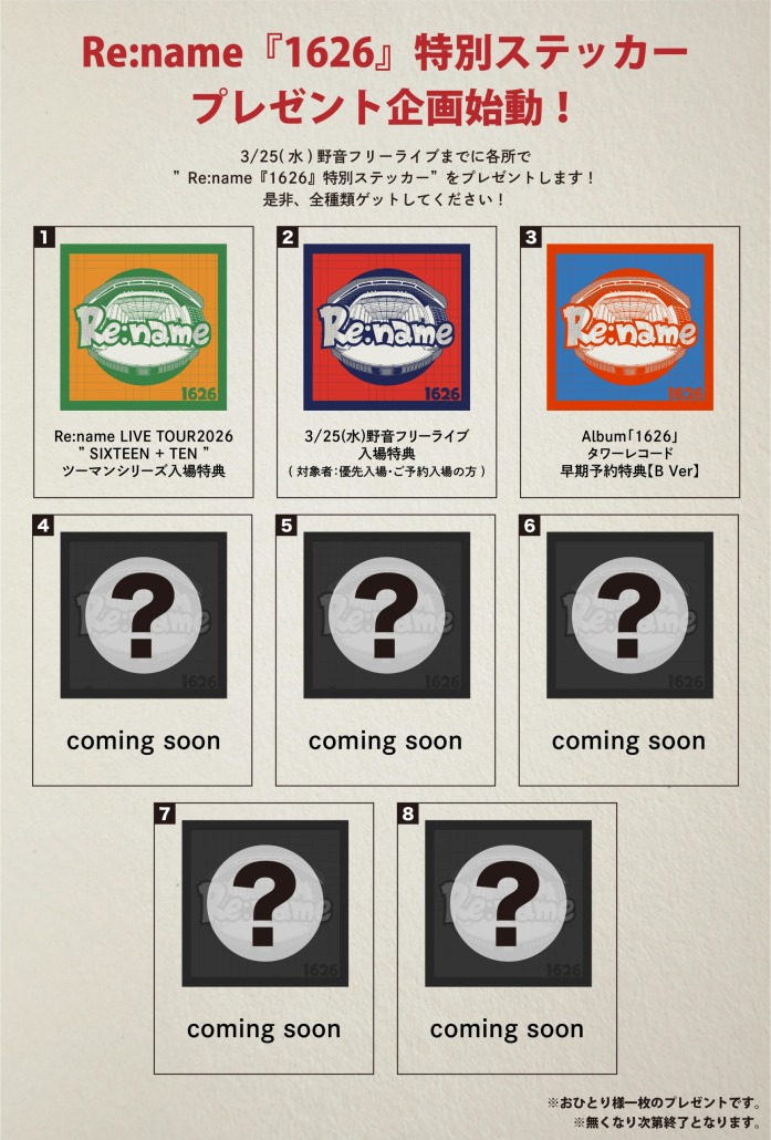 【解禁】Re:name『1626』特別ステッカープレゼント企画始動!